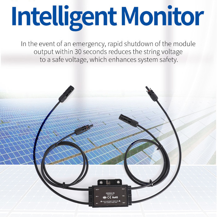 Le modèle GD004-20/30 est conçu pour l'arrêt d'urgence des onduleurs solaires dans les systèmes d'énergie solaire résidentiels, commerciaux et utilitaires.Sa conception compacte (120 × 77 × 17 mm) et sa protection IP68 le rendent adapté à divers environnements d'installation.